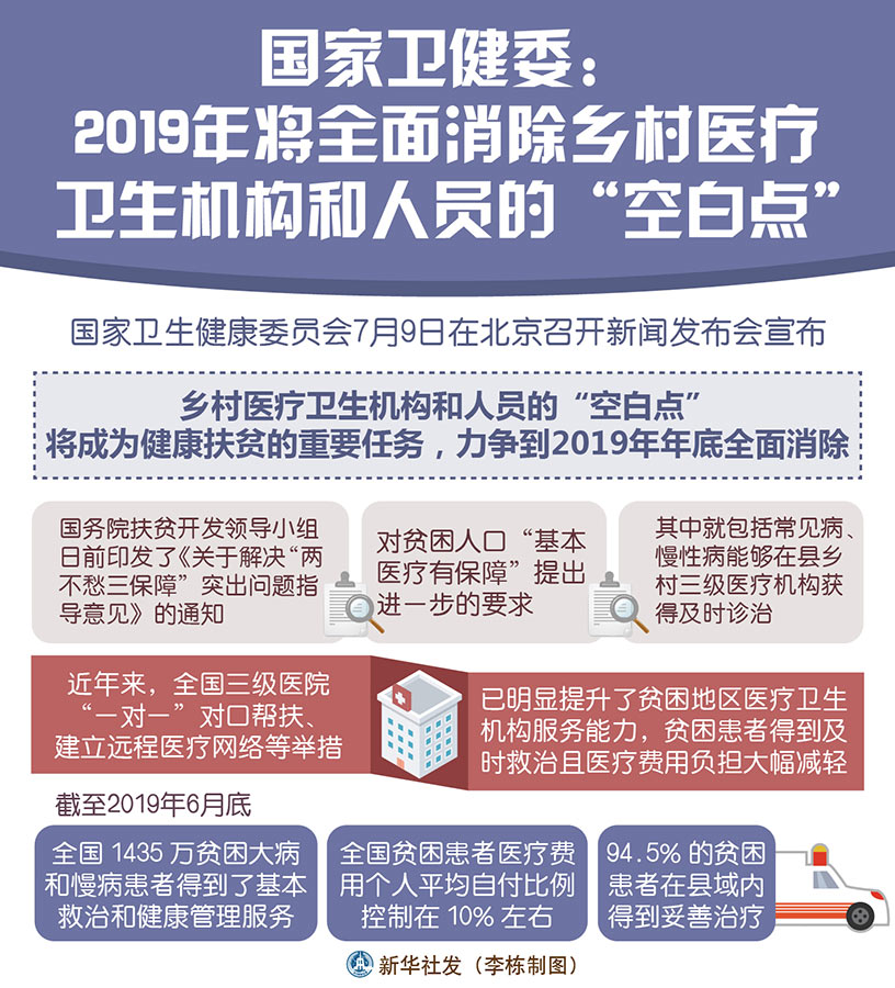 新華社北京7月9日電(記者屈婷、王秉陽)少數(shù)地區(qū)仍有衛(wèi)生室“空白村”,“三區(qū)三州”深度貧困地區(qū)有的鄉(xiāng)鎮(zhèn)缺少全科醫(yī)生……國家衛(wèi)生健康委員會9日在京召開新聞發(fā)布會宣布,像上述這些鄉(xiāng)村醫(yī)療衛(wèi)生機構(gòu)和人員的“空白點”,將成為健康扶貧的重要任務,力爭到今年年底全面消除。