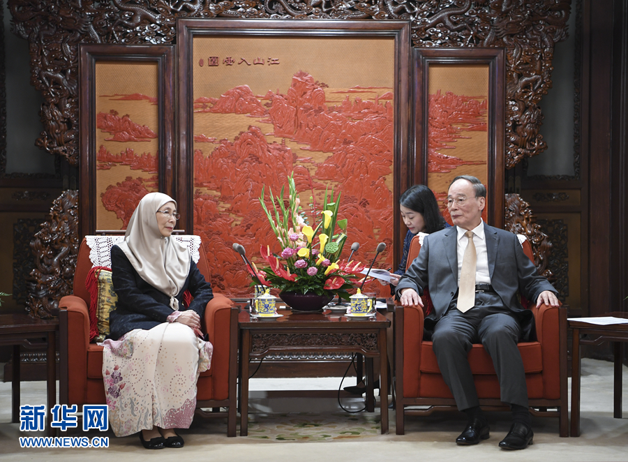 7月9日,國家副主席王岐山在北京中南海會見馬來西亞副總理旺·阿茲莎。 新華社記者 張領 攝