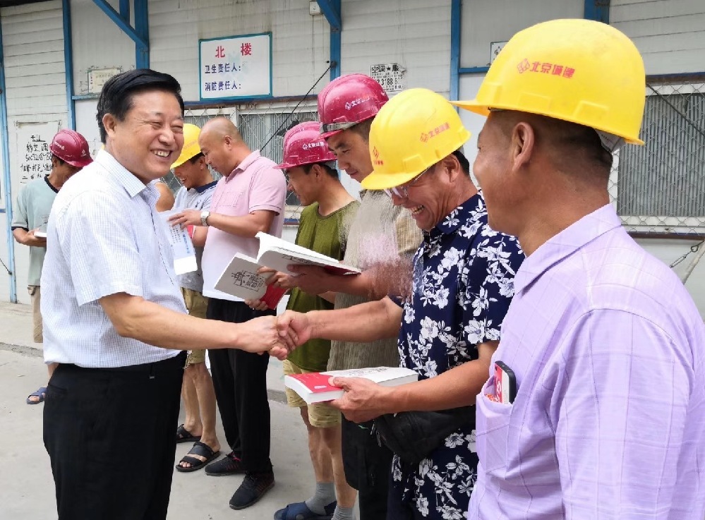 朱時華向農(nóng)民工贈書。(圖片由朱時華提供)
