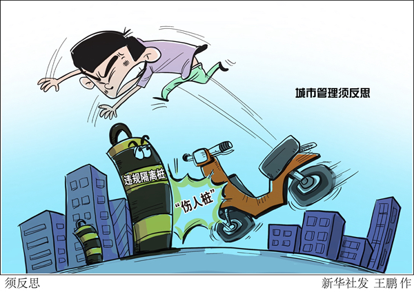 漫畫:須反思 近日,一位鄭州市民騎電動車撞上隔離樁受傷,經(jīng)搶救無效死亡。記者在鄭州采訪了解到,醫(yī)院曾接診過很多撞隔離樁的受傷者,有的破皮流血,有的刺穿腳掌,有的摔斷腿骨。隔離樁變“傷人樁”警示城市管理不能任性粗放,應(yīng)堅持以人為本,要像繡花一樣精細,否則害民不淺。新華社發(fā) 王鵬 作