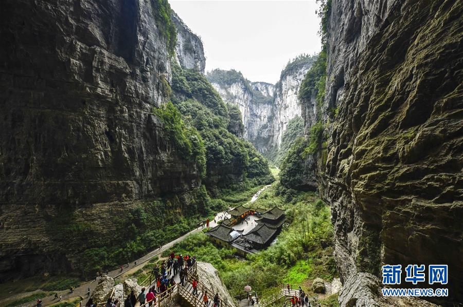 游客在重慶市武隆區(qū)的天生三橋景區(qū)游覽(2019年3月27日攝)。新華社記者 劉潺 攝