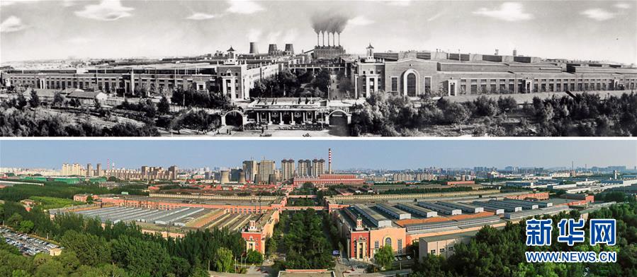 拼版照片:上圖為20世紀(jì)50年代的第一汽車制造廠廠區(qū)(資料圖片);下圖為2019年6月12日無人機拍攝的一汽廠區(qū)全景(新華社記者 許暢 攝)。新華社發(fā)