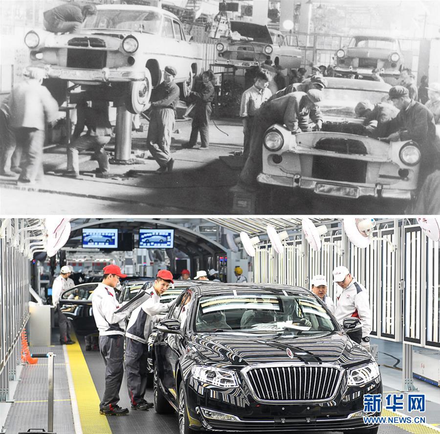 拼版照片:上圖為20世紀(jì)50年代拍攝的第一批紅旗轎車生產(chǎn)線(資料照片);下圖為在一汽紅旗總裝車間內(nèi),一汽紅旗職工在對生產(chǎn)的紅旗轎車進行靜檢作業(yè)(新華社記者許暢2019年4月9日攝)。新華社發(fā)