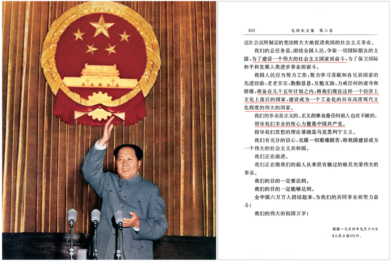 毛澤東同志在1954年第一屆全國(guó)人民代表大會(huì)第一次全體會(huì)議致開(kāi)幕詞時(shí)宣布:準(zhǔn)備在幾個(gè)五年計(jì)劃之內(nèi),將我國(guó)“建設(shè)成為一個(gè)工業(yè)化的具有高度現(xiàn)代文化程度的偉大的國(guó)家”,強(qiáng)調(diào)“領(lǐng)導(dǎo)我們事業(yè)的核心力量是中國(guó)共產(chǎn)黨”。左圖為毛澤東同志在第一屆全國(guó)人大第一次會(huì)議上致開(kāi)幕詞;右圖為毛澤東同志在開(kāi)幕詞中的重要論述。