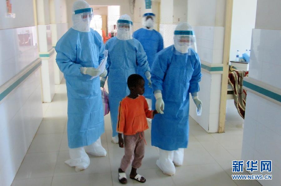 2014年10月11日,在塞拉利昂首都弗里敦,來自中國的醫(yī)護(hù)人員護(hù)送埃博拉留觀患者進(jìn)入病房。新華社發(fā)(孫捷 攝)