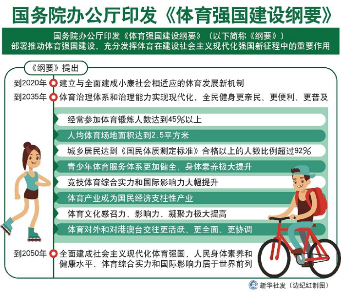 《綱要》提出,到2020年,建立與全面建成小康社會相適應(yīng)的體育發(fā)展新機(jī)制。到2035年,體育治理體系和治理能力實現(xiàn)現(xiàn)代化,全民健身更親民、更便利、更普及,經(jīng)常參加體育鍛煉人數(shù)達(dá)到45%以上,人均體育場地面積達(dá)到2.5平方米,城鄉(xiāng)居民達(dá)到《國民體質(zhì)測定標(biāo)準(zhǔn)》合格以上的人數(shù)比例超過92%;青少年體育服務(wù)體系更加健全,身體素養(yǎng)極大提升;競技體育綜合實力和國際影響力大幅提升,體育產(chǎn)業(yè)成為國民經(jīng)濟(jì)支柱性產(chǎn)業(yè),體育文化感召力、影響力、凝聚力極大提高,體育對外和對港澳臺交往更活躍、更全面、更協(xié)調(diào)。到2050年,全面建成社會主義現(xiàn)代化體育強(qiáng)國,人民身體素養(yǎng)和健康水平、體育綜合實力和國際影響力居于世界前列。