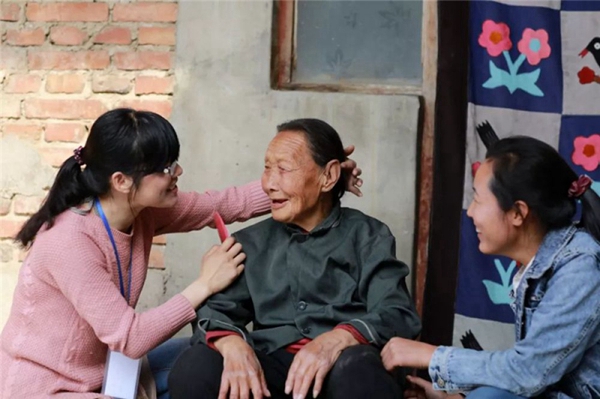 2016年4月11日,河北省邢臺市內(nèi)丘縣金店鎮(zhèn)韓郝莊村大學生“村官”田少微(左)在和孤寡老人聊天。
