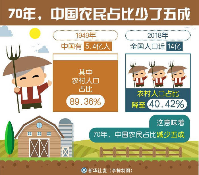 1949年中國有5.4億人,其中農(nóng)村人口占比89.36%;2018年,全國人口已近14億,農(nóng)村人口占比卻降至40.42%。這意味著,70年,中國農(nóng)民占比減少五成。