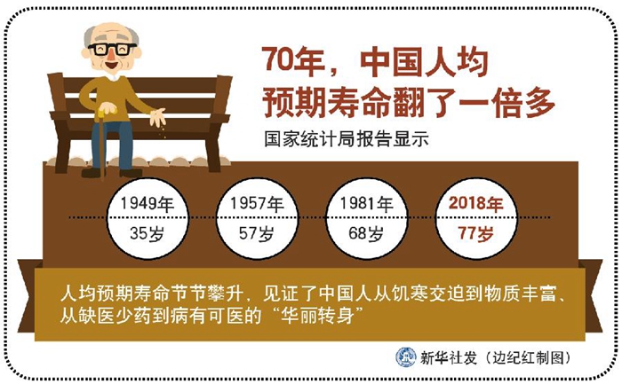 國家統(tǒng)計局報告顯示,1949年35歲,1957年57歲,1981年68歲,2018年77歲——人均預(yù)期壽命節(jié)節(jié)攀升,見證了中國人從饑寒交迫到物質(zhì)豐富、從缺醫(yī)少藥到病有可醫(yī)的“華麗轉(zhuǎn)身”——