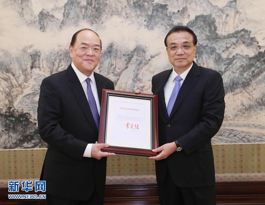 新華社北京9月11日電(記者劉歡)國務(wù)院總理李克強(qiáng)9月11日上午在中南海紫光閣會見賀一誠,頒發(fā)任命他為中華人民共和國澳門特別行政區(qū)第五任行政長官的國務(wù)院第719號令。