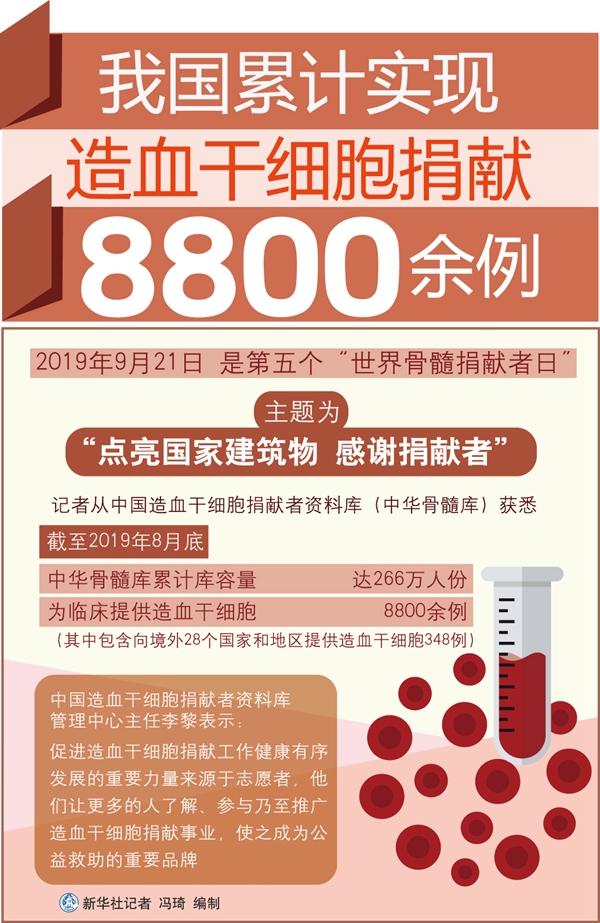 新華社西安9月21日電(記者藺娟 吳鴻波)記者從中國造血干細(xì)胞捐獻者資料庫(中華骨髓庫)獲悉,截至2019年8月底,中華骨髓庫累計庫容量已達266萬人份,為臨床提供造血干細(xì)胞8800余例,其中包含向境外28個國家和地區(qū)提供造血干細(xì)胞348例。
