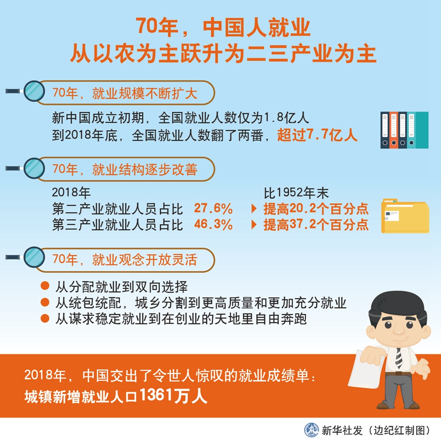 新華社北京9月24日電(記者葉昊鳴)從新中國成立之初大多數勞動者以農為主,到2018年第二、三產業(yè)就業(yè)人員占比超七成,服務業(yè)占主導的現代就業(yè)模式逐步形成,并日漸成為推動我國經濟社會發(fā)展的重要力量。
