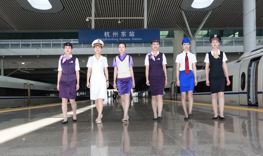 10月2日,浙江杭州。杭州客運段列車員穿上不同的鐵路制服。作者:沈克勤