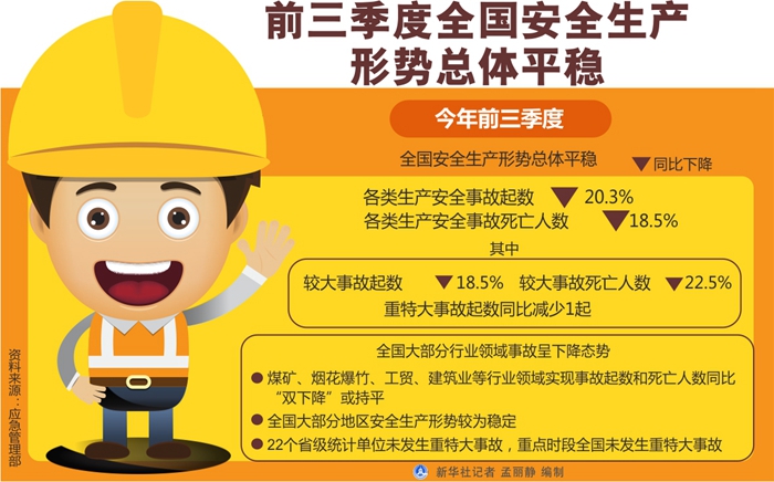 應(yīng)急管理部有關(guān)負責(zé)人表示,前三季度,全國大部分行業(yè)領(lǐng)域事故呈下降態(tài)勢。煤礦、煙花爆竹、工貿(mào)、建筑業(yè)等行業(yè)領(lǐng)域?qū)崿F(xiàn)事故起數(shù)和死亡人數(shù)同比“雙下降”或持平。全國大部分地區(qū)安全生產(chǎn)形勢較為穩(wěn)定。22個省級統(tǒng)計單位未發(fā)生重特大事故,重點時段全國未發(fā)生重特大事故。