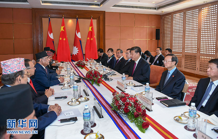 10月13日,國(guó)家主席習(xí)近平在加德滿都下榻飯店會(huì)見尼泊爾共產(chǎn)黨聯(lián)合主席普拉昌達(dá)。 新華社記者 謝環(huán)馳 攝