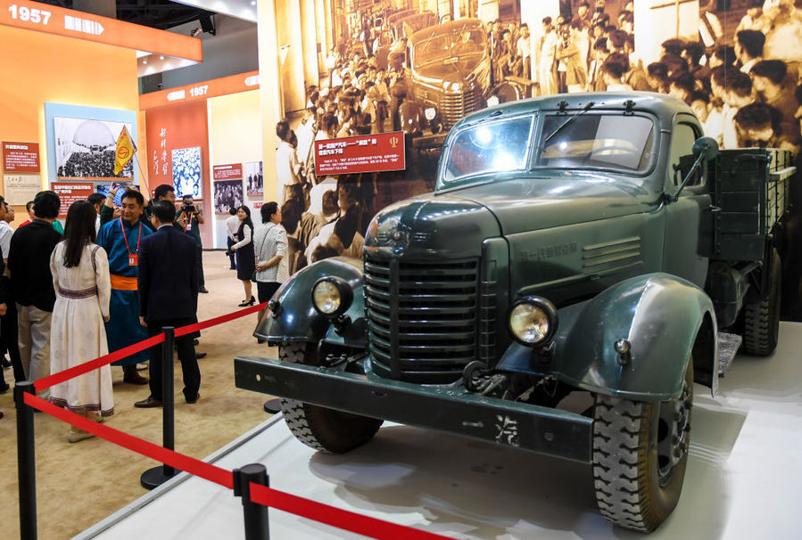 “偉大歷程 輝煌成就——慶祝中華人民共和國(guó)成立70周年大型成就展”上1956年制造的“解放”牌汽車(chē)。新華社記者彭源攝