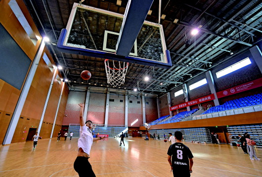學(xué)生們?cè)谀祥_(kāi)大學(xué)津南校區(qū)體育館內(nèi)運(yùn)動(dòng)(10月14日攝)。新華社記者李然攝