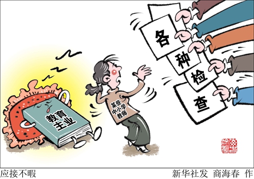 事實(shí)上,早在今年3月中辦就發(fā)布《關(guān)于解決形式主義突出問題為基層減負(fù)的通知》,強(qiáng)調(diào)今年要解決一些困擾基層的形式主義問題,切實(shí)為基層減負(fù)?!靶氯A視點(diǎn)”記者近日調(diào)查發(fā)現(xiàn),在一些地方的中小學(xué),各種檢查以及與教學(xué)無關(guān)的活動(dòng)紛紛進(jìn)校園,令教師們不堪重負(fù)甚至影響了教學(xué)工作。