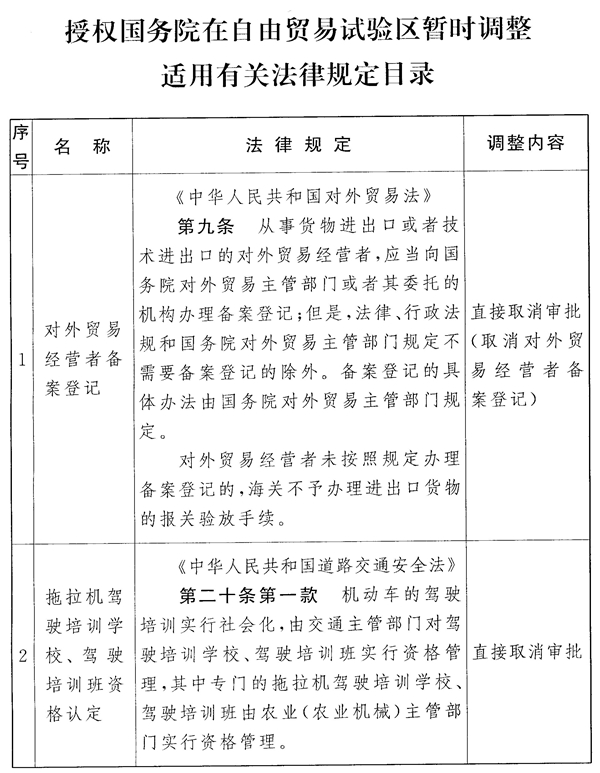 全國人民代表大會常務(wù)委員會關(guān)于授權(quán)國務(wù)院在自由貿(mào)易試驗(yàn)區(qū)暫時調(diào)整適用有關(guān)法律規(guī)定的決定