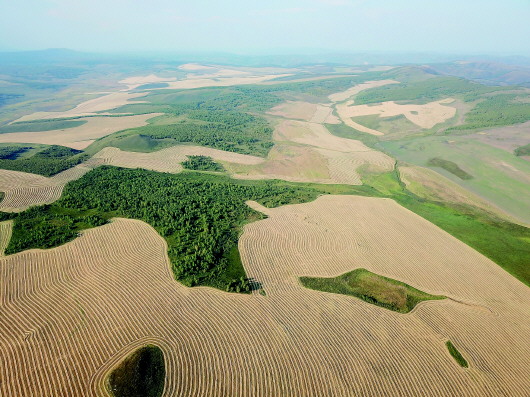 牧民高某說(shuō):“農(nóng)場(chǎng)的人每年都轉(zhuǎn)著圈開地。新開的地里還有草根草皮,種幾年糧食就看不到草根了?!?/p>