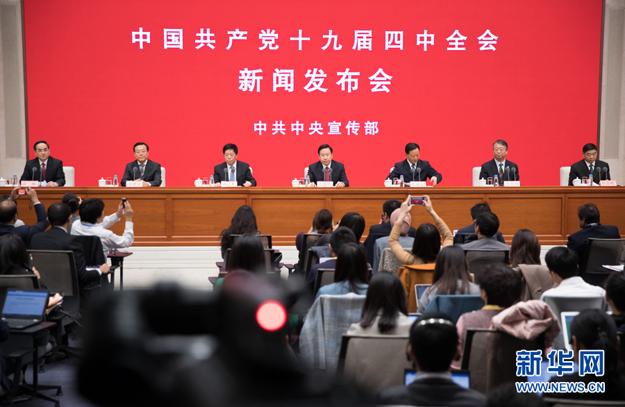 11月1日,中共中央宣傳部在北京舉行中國共產(chǎn)黨十九屆四中全會新聞發(fā)布會,請中央宣傳部分管日常工作的副部長、中央政策研究室副主任王曉暉,中央政策研究室分管日常工作的副主任江金權(quán),中央財經(jīng)委員會辦公室分管日常工作的副主任韓文秀,全國人大常委會法工委主任、港澳基本法委主任沈春耀,司法部黨組書記、副部長袁曙宏,全國政協(xié)副秘書長舒啟明介紹有關(guān)情況,并答記者問。中央宣傳部副部長、國務(wù)院新聞辦公室主任徐麟主持新聞發(fā)布會。 新華社記者金立旺攝