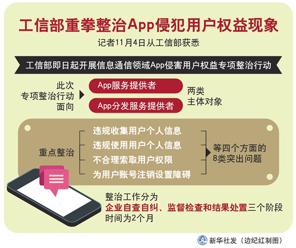 新華社北京11月4日電(記者張辛欣)記者4日從工信部獲悉,工信部即日起開展信息通信領(lǐng)域App侵害用戶權(quán)益專項(xiàng)整治行動(dòng)。對違規(guī)收集用戶個(gè)人信息、違規(guī)使用用戶個(gè)人信息等8類突出問題重拳整治。