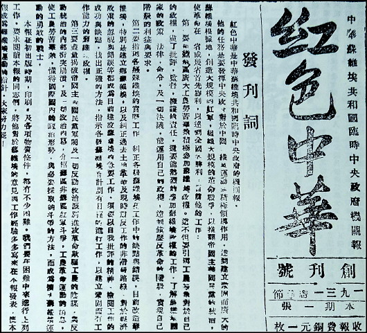 一個(gè)月后的12月11日,中華蘇維埃共和國臨時(shí)中央政府機(jī)關(guān)報(bào)《紅色中華》創(chuàng)刊。1932年2月4日起,《紅色中華》改為中國共產(chǎn)黨蘇區(qū)中央局、中國共產(chǎn)主義青年團(tuán)蘇區(qū)中央局、中華蘇維埃中央政府、全總蘇區(qū)執(zhí)行局合辦的中央機(jī)關(guān)報(bào)。