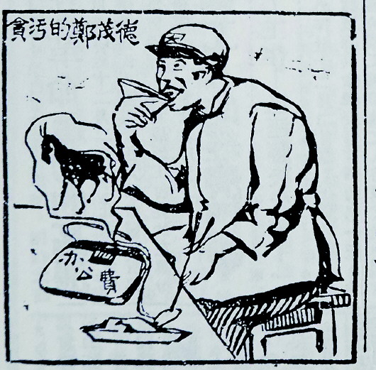 此事被揭露后,《紅色中華》在第134期發(fā)表了一幅《貪污分子鄭德茂》漫畫,畫中戴著五角星帽子用“辦公費(fèi)”大吃大喝的鄭茂德,腦海里正想著一匹騾子,貪污分子的丑陋形象躍然紙上。