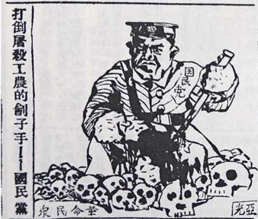 1933年7月14日,《紅色中華》第1版刊發(fā)潘漢年撰寫的社論《反對(duì)國民黨法西斯的白色恐怖》,文章配發(fā)黃亞光創(chuàng)作的漫畫《打倒屠殺工農(nóng)的劊子手——國民黨》,畫面上的國民黨兇手舉著滴血的屠刀,踏著一堆革命群眾的尸骨,將國民黨反動(dòng)派與人民為敵的本性揭露無遺。