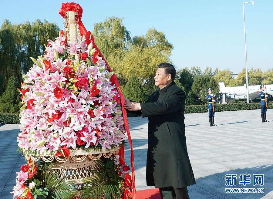 11月8日,中共中央總書記、國家主席、中央軍委主席習(xí)近平出席慶??哲姵闪?0周年主題活動(dòng),代表黨中央和中央軍委,對空軍成立70周年表示熱烈祝賀,向空軍全體官兵致以誠摯問候。這是習(xí)近平來到位于北京市昌平區(qū)的中國航空博物館,向人民空軍英烈敬獻(xiàn)花籃。 新華社記者 李剛 攝