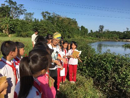 ??谒墒髮W(xué)堂創(chuàng)始人高高老師在給海口瓊山十二小的學(xué)生講解濕地生物的特點(diǎn)