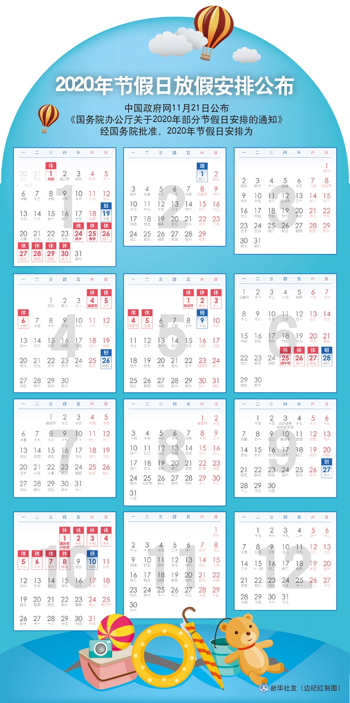 新華社北京11月21日電(記者安蓓)中國政府網(wǎng)21日公布《國務(wù)院辦公廳關(guān)于2020年部分節(jié)假日安排的通知》,經(jīng)國務(wù)院批準,2020年節(jié)假日安排為:元旦1月1日放假,共1天;春節(jié)1月24日至30日放假調(diào)休,共7天,1月19日(星期日)、2月1日(星期六)上班;清明節(jié)4月4日至6日放假調(diào)休,共3天;勞動節(jié)5月1日至5日放假調(diào)休,共5天,4月26日(星期日)、5月9日(星期六)上班;端午節(jié)6月25日至27日放假調(diào)休,共3天,6月28日(星期日)上班;國慶節(jié)、中秋節(jié)10月1日至8日放假調(diào)休,共8天,9月27日(星期日)、10月10日(星期六)上班。