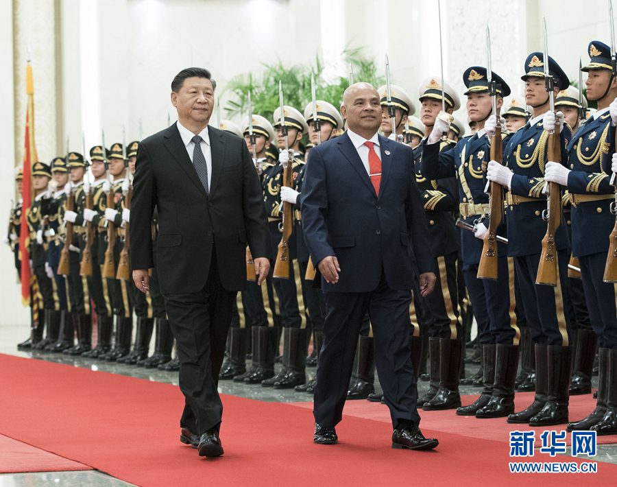 12月13日,國家主席習(xí)近平在北京人民大會堂同密克羅尼西亞聯(lián)邦總統(tǒng)帕努埃洛會談。這是會談前,習(xí)近平在人民大會堂北大廳為帕努埃洛舉行歡迎儀式。 新華社記者 申宏 攝