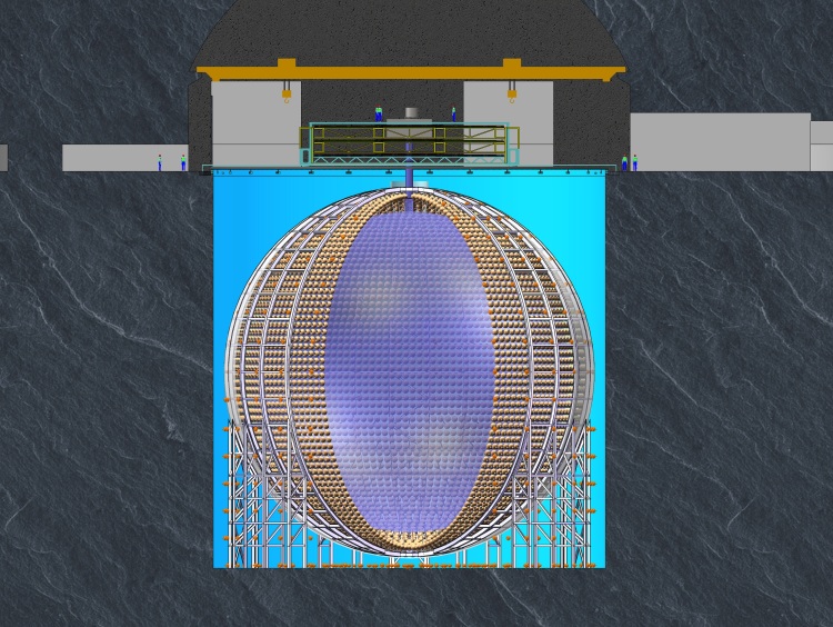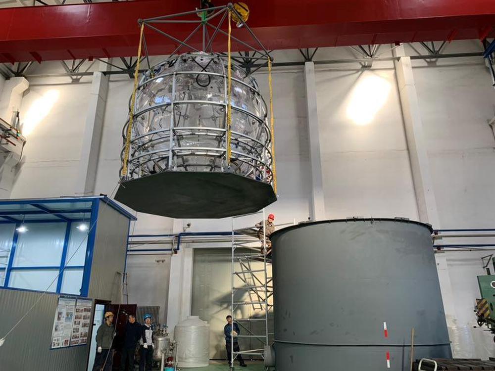 他們將把一個(gè)直徑達(dá)35.4米的有機(jī)玻璃球安裝在廣東省江門市西南部的打石山中。施工人員已經(jīng)在700多米深的花崗巖下方挖出一個(gè)空洞,作為未來的實(shí)驗(yàn)大廳。