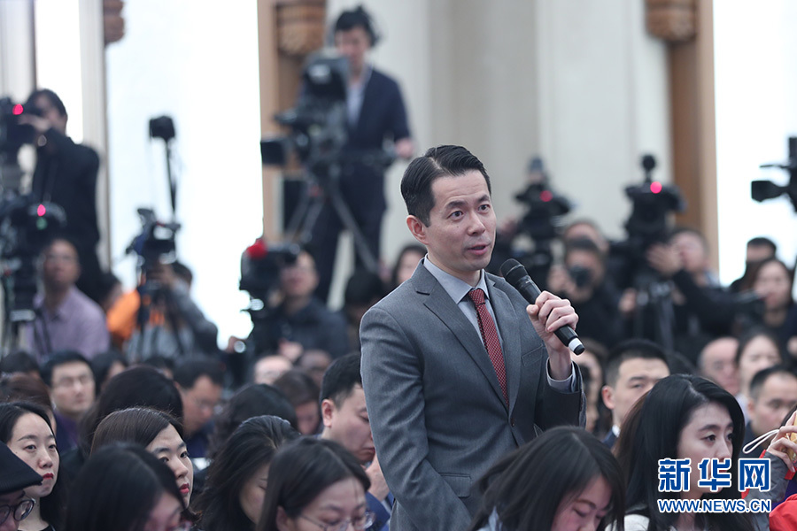 十三屆全國(guó)人大二次會(huì)議3月4日上午11時(shí)15分在人民大會(huì)堂新聞發(fā)布廳舉行新聞發(fā)布會(huì),由大會(huì)發(fā)言人張業(yè)遂就大會(huì)議程和人大工作相關(guān)的問(wèn)題回答中外記者提問(wèn)。圖為美國(guó)有線電視新聞?dòng)浾咛釂?wèn)。新華網(wǎng)/中國(guó)政府網(wǎng) 陳杰 攝