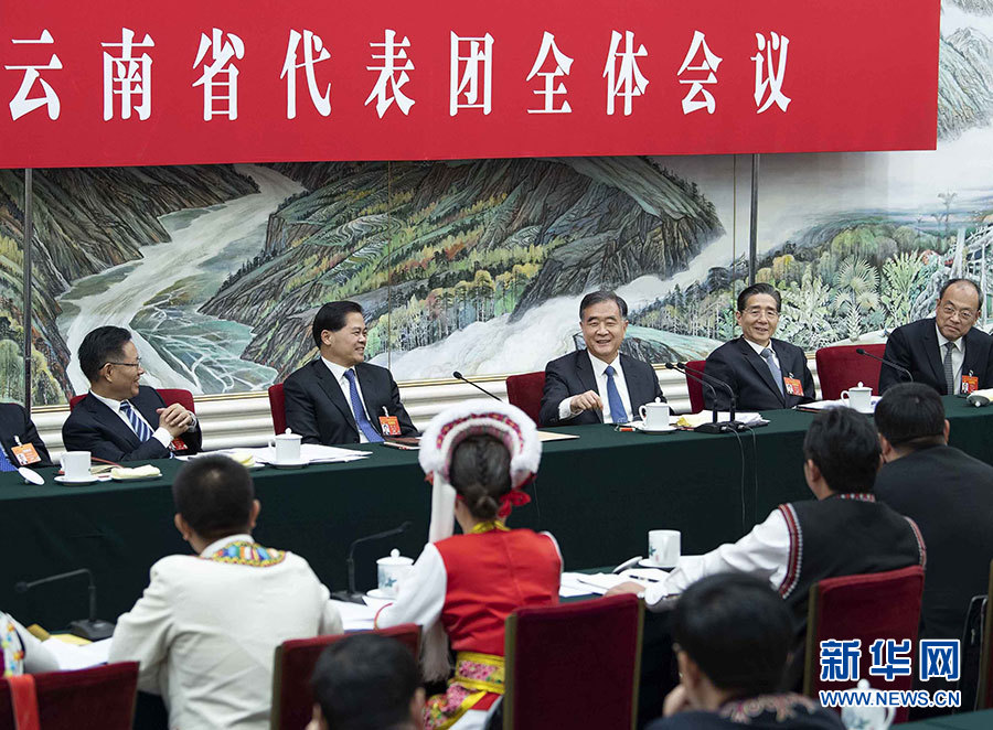 汪洋分別參加臺灣代表團、云南代表團審議。在臺灣代表團,汪洋在認真聽取符之冠、陳云英、陳軍等代表發(fā)言后指出,習(xí)近平總書記在《告臺灣同胞書》發(fā)表40周年紀念會上的重要講話,是指引新時代對臺工作的綱領(lǐng)性文獻。要學(xué)深悟透講話的精神實質(zhì)和核心要義,深刻認識兩岸統(tǒng)一是歷史大勢,牢牢把握對臺工作正確方向。要廣泛深入聽取臺灣同胞的意見,完善配套政策,把促進兩岸經(jīng)濟文化交流合作“31條措施”等惠臺舉措落到實處,深化兩岸融合發(fā)展。要堅持一個中國原則和“九二共識”,堅決反對“臺獨”,團結(jié)更多臺灣同胞共擔民族大義,為推動兩岸關(guān)系和平發(fā)展、推進祖國和平統(tǒng)一進程作出更大貢獻。在云南代表團,汪洋認真聽取阮成發(fā)、馬正山、玉龍等代表的發(fā)言,充分肯定過去一年云南改革發(fā)展取得的成績。他希望云南深入貫徹習(xí)近平總書記對云南工作的重要指示精神,堅定不移落實黨的民族政策和宗教工作基本方針,大力幫助人口較少民族和“直過民族”發(fā)展,努力打造民族團結(jié)進步示范區(qū)。要堅決打好脫貧攻堅戰(zhàn),努力攻克深度貧困堡壘,著力提高脫貧質(zhì)量,確保全面小康路上一個都不掉隊。