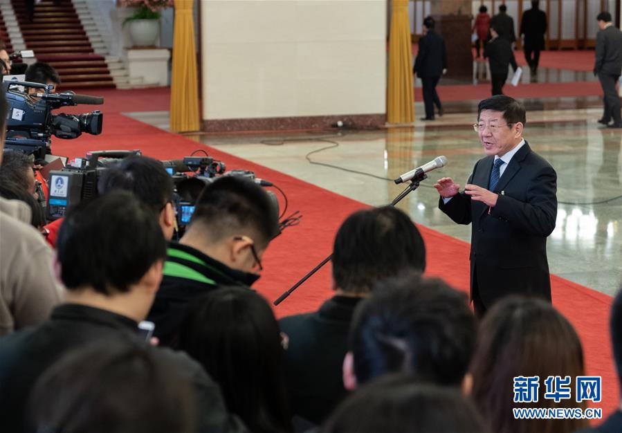 3月12日,十三屆全國(guó)人大二次會(huì)議在北京人民大會(huì)堂舉行第三次全體會(huì)議。這是國(guó)家林業(yè)和草原局局長(zhǎng)張建龍?jiān)凇安块L(zhǎng)通道”接受采訪。 新華社記者畢曉洋攝