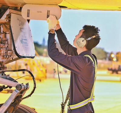10日,機(jī)務(wù)人員進(jìn)行起飛前的各項檢查。當(dāng)日,??诿捞m機(jī)場飛往北京大興機(jī)場的首個航班順利起航。朱榮鵬 紀(jì)巧珠攝影報道(影像中國)
