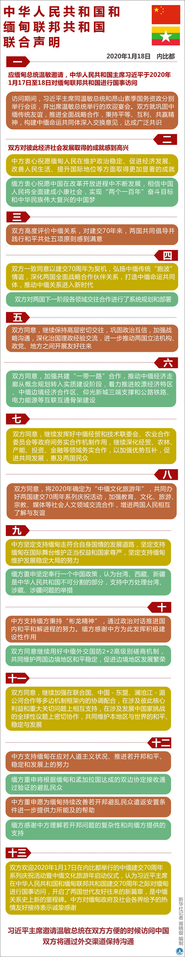 新華社內(nèi)比都1月18日電 中華人民共和國和緬甸聯(lián)邦共和國聯(lián)合聲明全文如下: