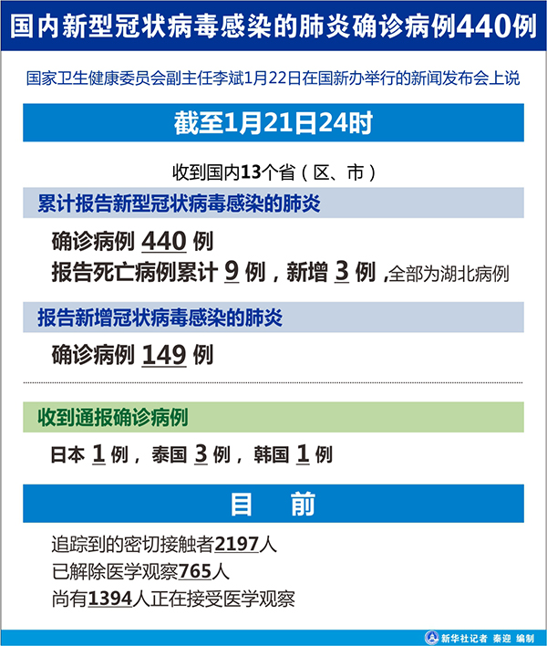 圖表:國內(nèi)新型冠狀病毒感染的肺炎確診病例440例 新華社記者 秦迎 編制
