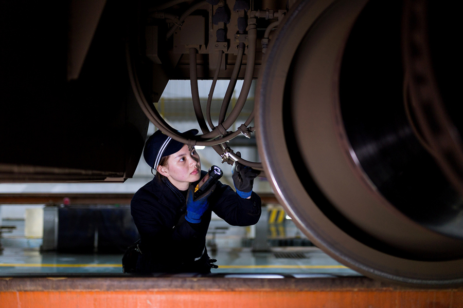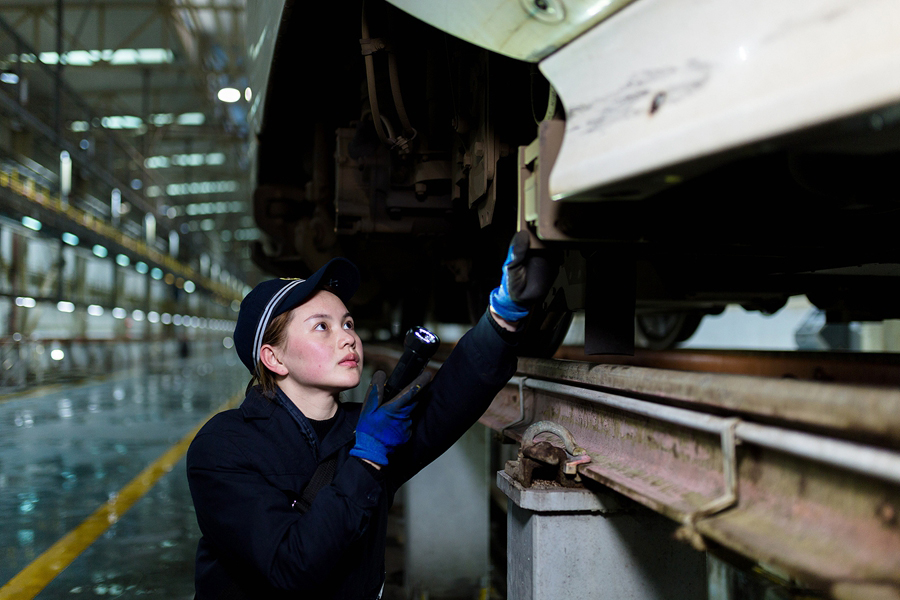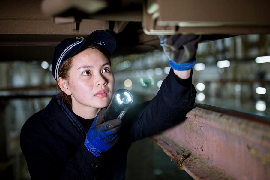 她們的作業(yè)分為有電作業(yè)和無電作業(yè)兩種狀態(tài)。有電作業(yè)主要是對高鐵車載設備進行試驗,檢查機柜內(nèi)設備顯示燈是否正常,機柜是否有異物、異味等;無電作業(yè)主要是對高鐵動車組車底的速度傳感器、應答器、軌道信息接收天線線圈進行防松脫檢查等。