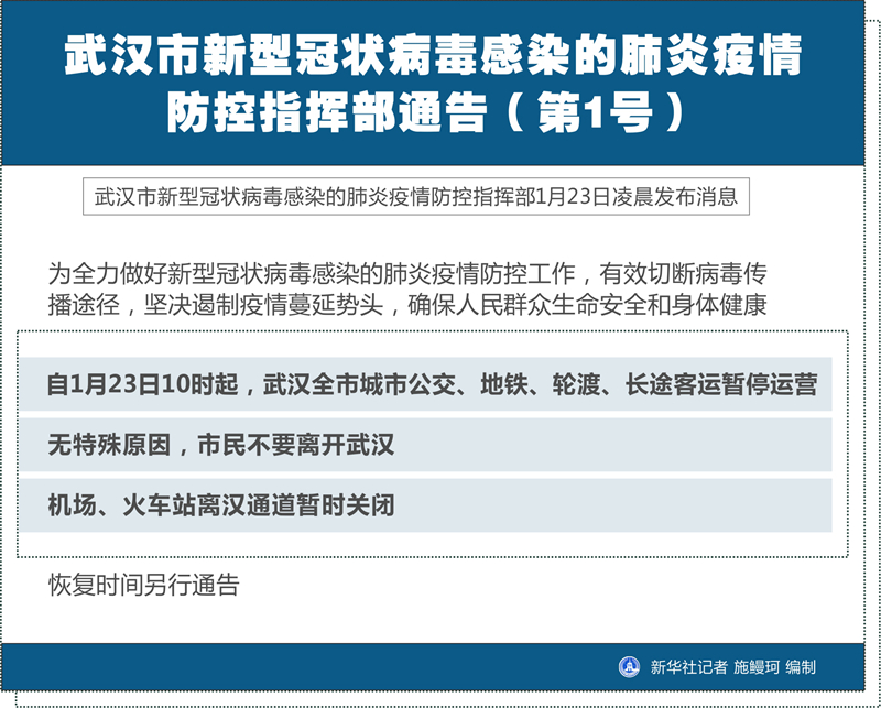 新華社武漢1月23日電(記者馮國(guó)棟)武漢市新型冠狀病毒感染的肺炎疫情防控指揮部1月23日凌晨發(fā)布消息,為全力做好新型冠狀病毒感染的肺炎疫情防控工作,有效切斷病毒傳播途徑,堅(jiān)決遏制疫情蔓延勢(shì)頭,確保人民群眾生命安全和身體健康,自1月23日10時(shí)起,武漢全市城市公交、地鐵、輪渡、長(zhǎng)途客運(yùn)暫停運(yùn)營(yíng);無(wú)特殊原因,市民不要離開(kāi)武漢;機(jī)場(chǎng)、火車站離漢通道暫時(shí)關(guān)閉?;謴?fù)時(shí)間另行通告。