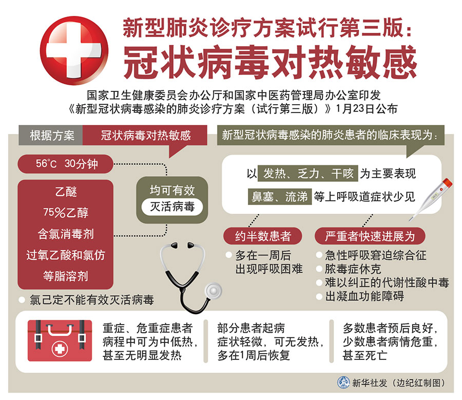 新華社北京1月23日電(記者田曉航、王秉陽)為進(jìn)一步指導(dǎo)全國科學(xué)規(guī)范做好新型冠狀病毒感染的肺炎病例診斷和醫(yī)療救治工作,在組織專家對診療方案進(jìn)行修訂基礎(chǔ)上,國家衛(wèi)生健康委員會辦公廳和國家中醫(yī)藥管理局辦公室印發(fā)《新型冠狀病毒感染的肺炎診療方案(試行第三版)》,23日公布。方案涉及冠狀病毒病原學(xué)特點(diǎn)、此次疫情的臨床特點(diǎn)、病例定義、鑒別診斷、病例的發(fā)現(xiàn)與報(bào)告等方面內(nèi)容,給出了包括中醫(yī)治療在內(nèi)的治療方案。