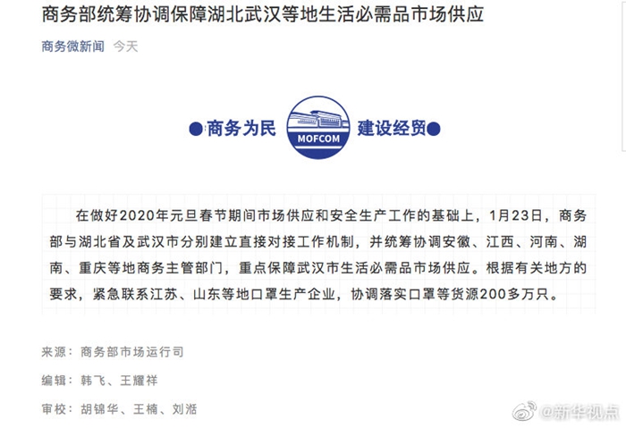 記者從商務(wù)部了解到,23日,商務(wù)部統(tǒng)籌協(xié)調(diào)安徽、江西、河南、湖南、重慶等地商務(wù)主管部門,重點(diǎn)保障武漢市生活必需品市場供應(yīng)。根據(jù)有關(guān)地方的要求,緊急聯(lián)系江蘇、山東等地口罩生產(chǎn)企業(yè),協(xié)調(diào)落實(shí)口罩等貨源200多萬只。(記者王雨蕭、陳煒偉)?