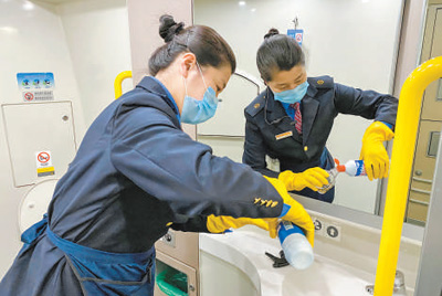 為應(yīng)對(duì)疫情,鐵路部門全力做好相關(guān)防控工作。圖為南昌開往南京的G1496次列車上,南昌客運(yùn)段工作人員認(rèn)真做好車廂清潔、消毒工作。鮑贛生 攝(人民視覺)