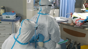 穿上隔離服的醫(yī)護(hù)人員只能露出一雙眼睛,誰也認(rèn)不出對方,于是他們進(jìn)入隔離區(qū)的第一件事,就是相互在隔離服上寫下對方的名字或者外號,有時(shí)還會(huì)藝術(shù)創(chuàng)作一下,這成了隔離病房里“神秘的儀式”。