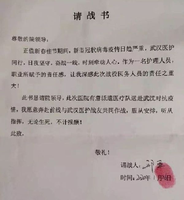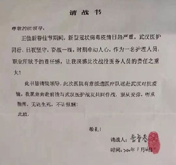甘肅省定西市人民醫(yī)院新生兒科護(hù)士長(zhǎng)曹愛(ài)春和護(hù)士邢亞半夜寫下請(qǐng)戰(zhàn)書(shū),懇請(qǐng)?jiān)悍脚鷾?zhǔn)奔赴一線。落款時(shí),兩人寫了八個(gè)字:無(wú)論生死,不計(jì)報(bào)酬。(定西市人民醫(yī)院供圖)
