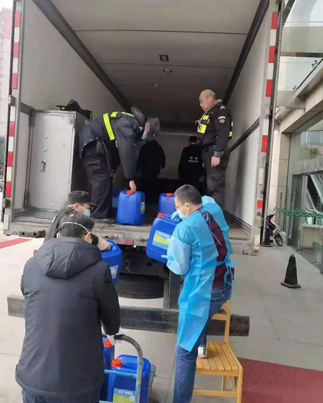 科技公司已經(jīng)下班,只留下2名員工,阜寧郵政的4名員工就成了主力,大家一起努力,花了3個(gè)小時(shí)總算將500箱共10噸的消毒液和一些醫(yī)護(hù)用品裝上了車。