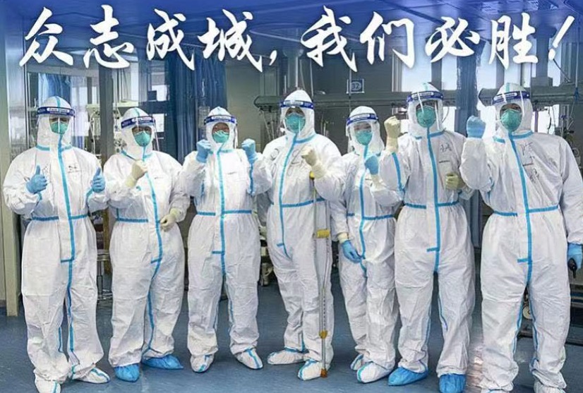 1月24日,武漢大學(xué)中南醫(yī)院重癥隔離病房內(nèi)的醫(yī)護(hù)人員一起鼓勁加油。