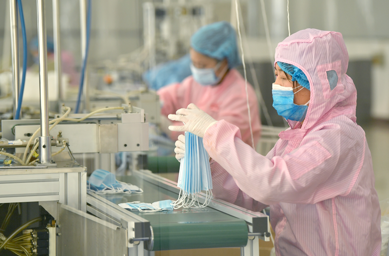 為助力抗擊新型冠狀病毒感染的肺炎疫情,陜西省西安市10家生產(chǎn)防護消毒用品的單位已緊急召回、招聘員工,滿負(fù)荷生產(chǎn),以保障口罩、消毒液等防護消毒用品的穩(wěn)定供給。圖為1月29日,西安市鄠邑區(qū)一公司員工在制作口罩。